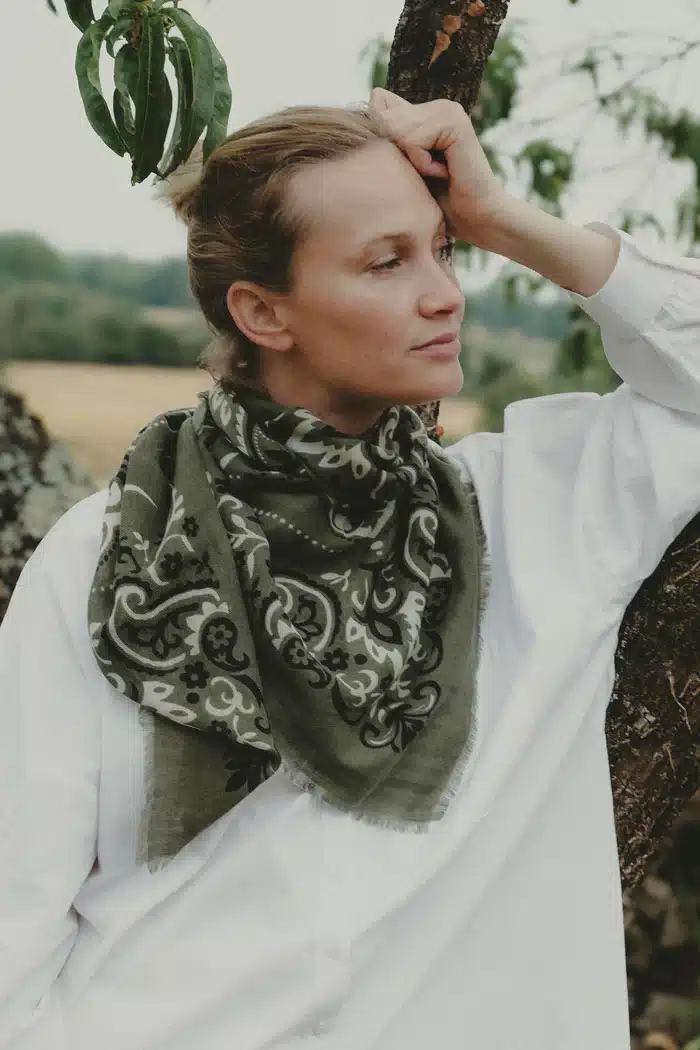 Villasta ja silkistä valmistettu, ylellisen pehmeä ja hengittävä, Maison Lecomte Flament -bandanahuivi. Huivi on ohuen ilmava, mutta lämmin – täydellinen huolettoman tyylikäs ranskalaisasuste!