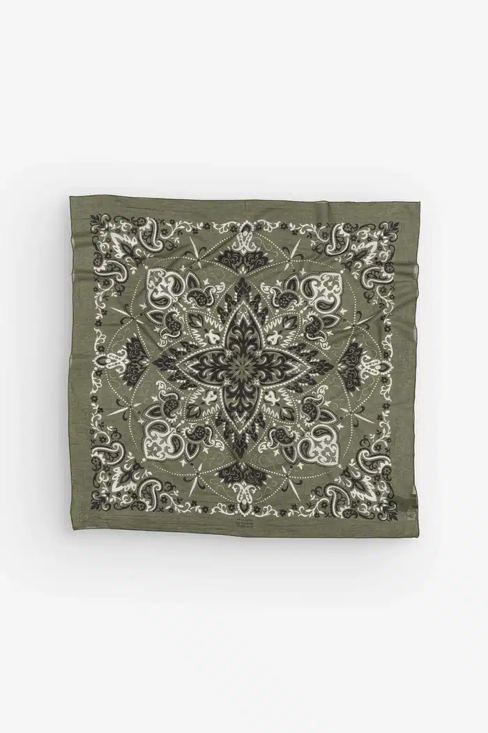 Luonnonpuuvillainen, pehmeä ja hengittävä, Maison Lecomte Flament -bandanahuivi. Huivi on ohuen ilmava ja kevyt – täydellinen huolettoman tyylikäs ranskalaisasuste!